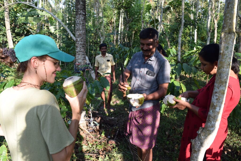 Whenever we had some time between meals or forest garden visits, we were invited to visit relatives and neighbors who showed us around their gardens or houses and answered more questions about local plants. For example, the ones drying in front of the house CarnationsCinnamon trees, whose branches are cut to make the inner bark into the familiar Cinnamon powder fruit plantations with countless fruits that we had never heard of before or climbing aids that we used to scramble up coconut palms. After the tour, there was always the obligatory tea or coffee with questions about where we come from, what we do and how we like India. Each meeting was full of warmth, friendliness and interest. A hospitality that we took back to Switzerland as a model.