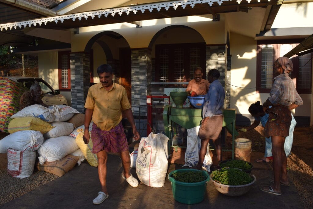 Full of zest for action, we were able to take part in the pepper harvest for a day together with the long-time harvester (even if it seemed a bit against hospitality) and were examined, commented on and photographed with amused smiles from various sides. The tools used for harvesting are a cloth for tying and collecting the green peppercorns and a single stile ladder (half ladder), which we first had to get used to. In the evening, we accompanied Saju as he took the harvest directly to the machine that FTAK had bought especially for this purpose to remove the stems. Tuktuks and cars brought enormous sacks full of pepper, a team that seemed to be well-rehearsed weighed the harvest of the respective producers, fed it into the machine and each grain was filled back into the sacks and the stems composted. A hustle and bustle that also provided an opportunity to exchange ideas.