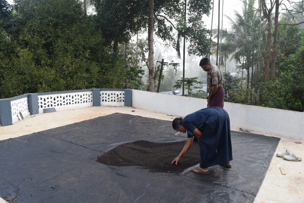 The next day, Saju made a small fire behind the house early in the morning to briefly put the peppercorns in boiling water before drying, so that the beautiful black color of the grains was guaranteed and the drying process in the sun could be reduced from five to two days. However, Saju and Shinoj explained to us when they once again answered our eternal questions. Normally, the grains would be placed directly on a flat roof or terrace to dry and turned regularly. After cleaning off small plant residues, the product is then ready for dispatch.