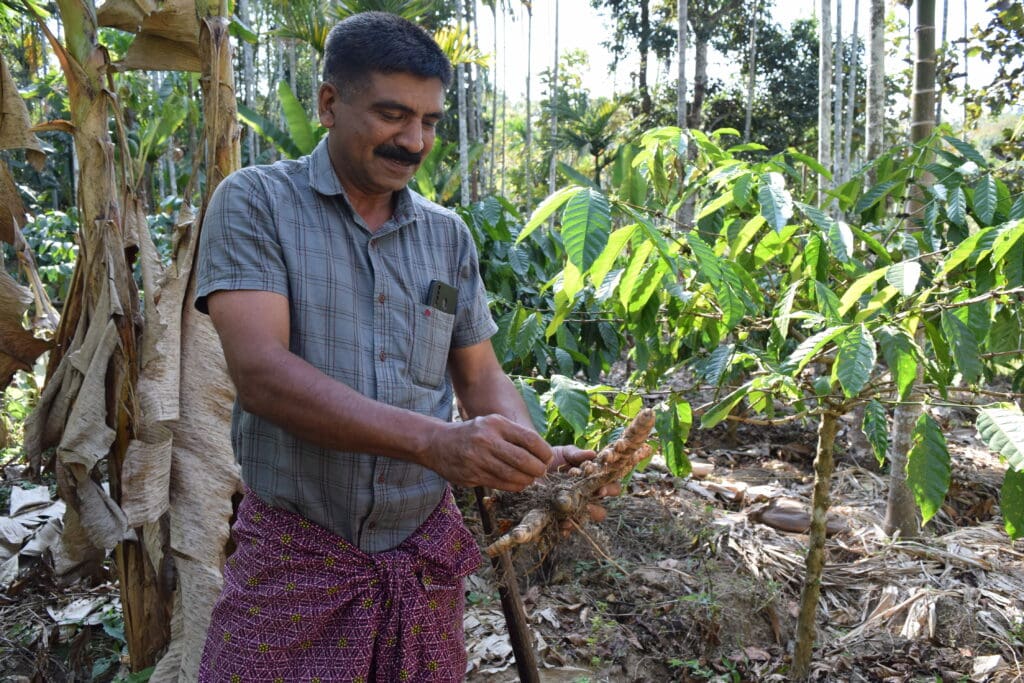 During the dry season, Saju has to water the forest garden once a week, occasionally adding some compost to the new plants, otherwise the garden manages almost on its own. The planting is clearly organized so that the various trees, shrubs etc. complement and support each other, making chemical treatments superfluous. The fact that there is no cocoa because the fruit has been damaged by mice and birds is nothing out of the ordinary. However, because the producers cultivate a variety of crops instead of relying on just one crop, this does not matter. Around Saju and Beena's house and forest garden, various crops are also grown for their own use: coconut palms, jackfruit, curry leaf, papaya and Nutmeg-trees and Cardamom. And the handful of goats provide fresh milk for the coffee. Everything was carefully explained to us by Saju, where possible we were shown how it is harvested and we were allowed to look, touch, smell and taste.