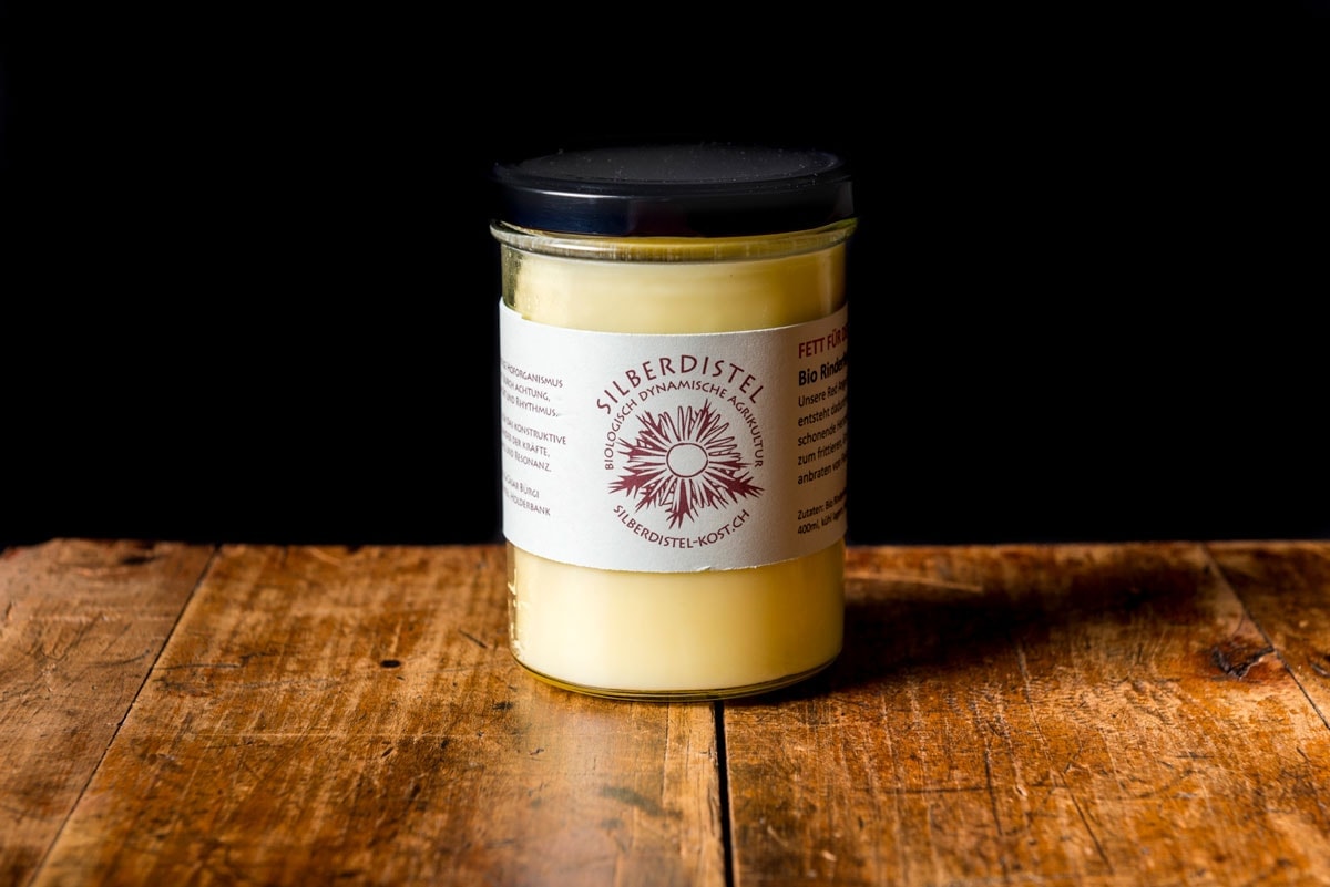«Fett für den Weltfrieden» nennt Cäsar Bürgi sein Produkt und ganz unrecht hat er damit nicht: Würden wir konsequent das Fett der in der Schweiz geschlachteten Rinder und Schweine nutzen, müssten wir nicht so viel Palmöl importieren. Das Nierenfett des Rinds eignet sich hervorragend zum Anbraten bei grosser Hitze, Frittieren und sogar zum Backen.