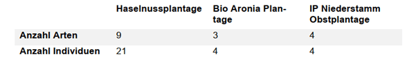 Ein differenziertes Bild zeigt sich bei der Artenvielfalt der Pflanzen zwischen den Plantagen: Die Zahl an Pflanzenarten innerhalb der Haselnussplantage ist zwar am geringsten, allerdings haben wir in Mettmenstetten sogenannte Biodiversitätsförderflächen (BFF) angelegt. Auf den Vergleichsbetrieben gibt es keine solchen Flächen in dieser Form. Werden die auf den Biodiversitätsförderflächen gezählten Arten in die Rechnung einbezogen, ist die Artenvielfalt der Pflanzen in der Haselnussplantage höher als bei den beiden Vergleichsflächen.