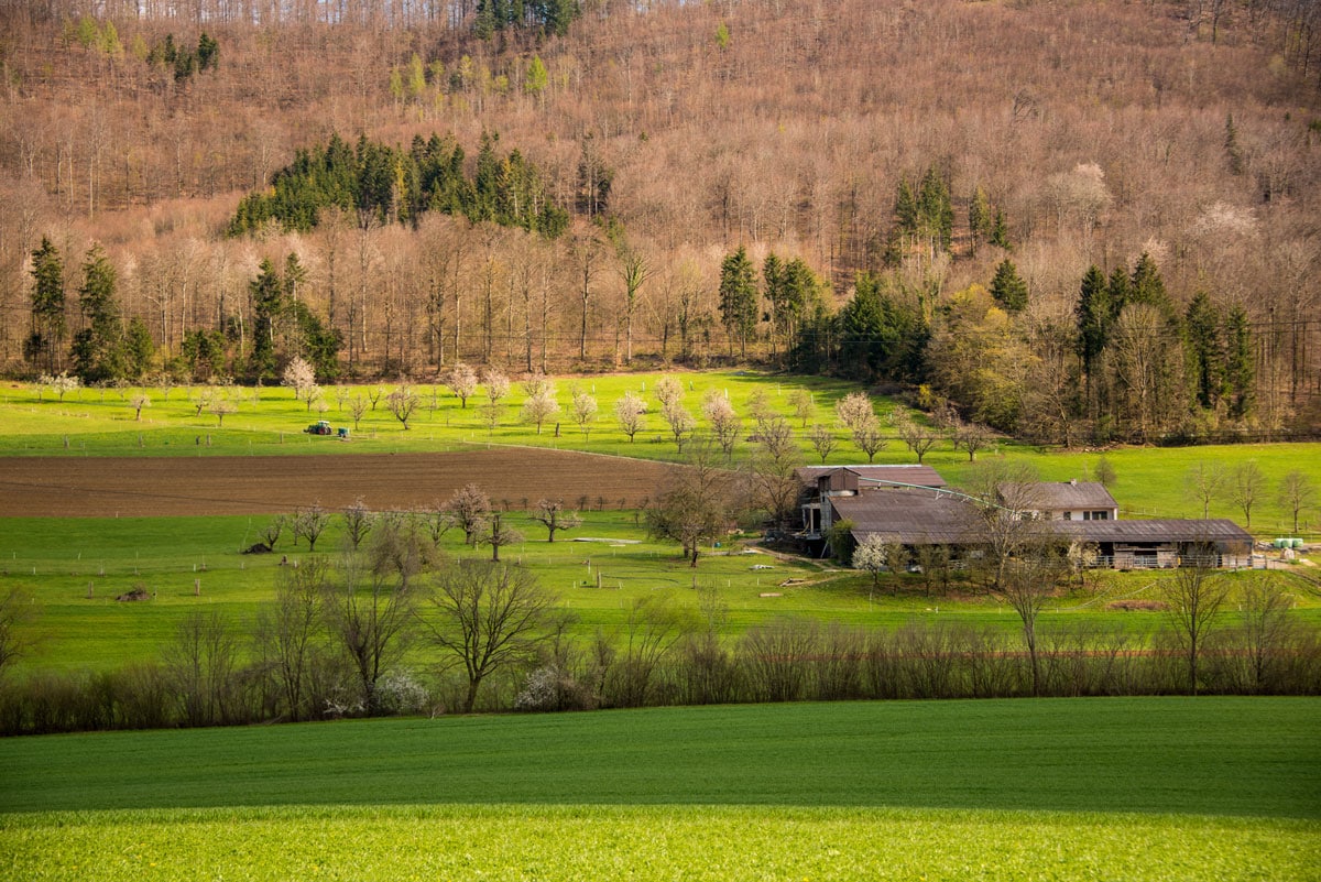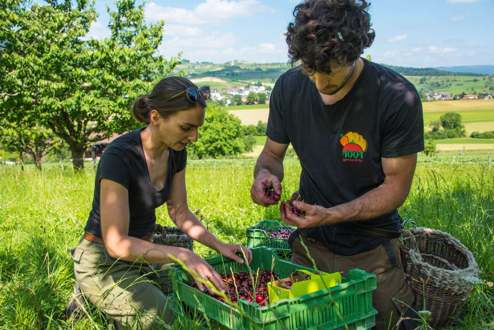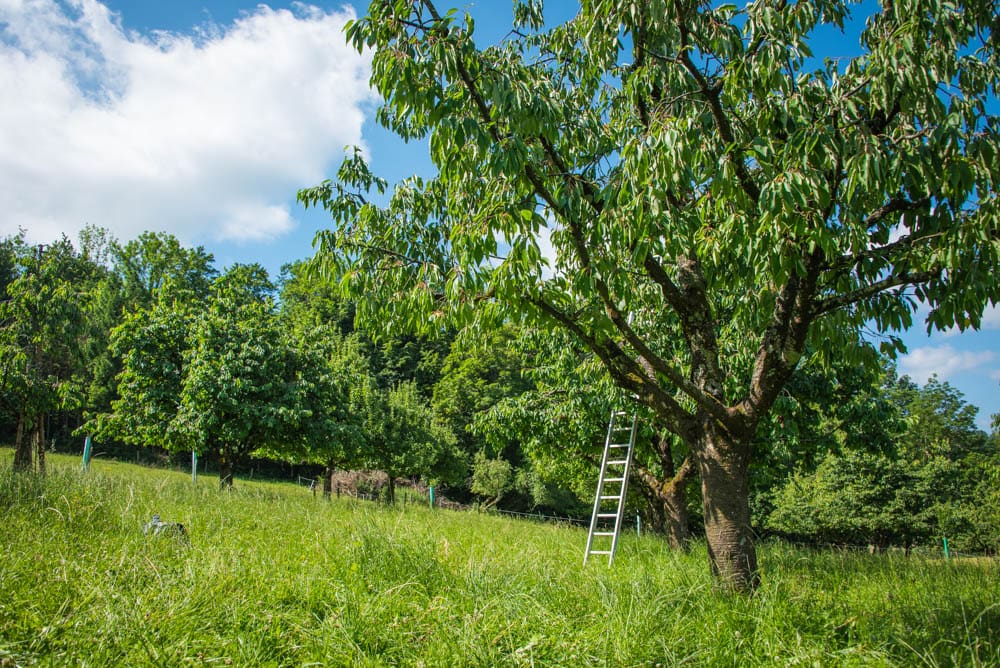 - Produzent*innen: Über 140 Hochstammbäume stehen auf dem 34 Hektaren grossen Riedackerhof. Gepflanzt wurden die Bäume vor mehreren Jahrzehnten von Christoph Rickenbachs Grossvater. Damals waren die Kirschen im Fricktal ein wichtiger Wirtschaftszweig und neben dem Tafelobst wurde vor allem auch Schnaps gebrannt. Noch heute prägen die Hochstammbäume das Landschaftsbild und sind ein wichtiger Lebensraum für viele bedrohte Tierarten. Dass auf dem Riedackerhof das Obst noch traditionell angebaut und mit hohen Leitern geerntet wird, ist vor allem Sepp zu verdanken. Dieser ist überzeugt: «Es ist kein Vergleich mit den wässrigen Früchten aus manchen Läden – das reife Obst von meinen grossen Bäumen schmeckt richtig gut und hält mich fit. Während der Kirschernte ernähre ich mich mehrere Wochen fast nur von Chriesi!» Hier findest du unseren Blog-Beitrag rund um die Hochstamm Kirschen.