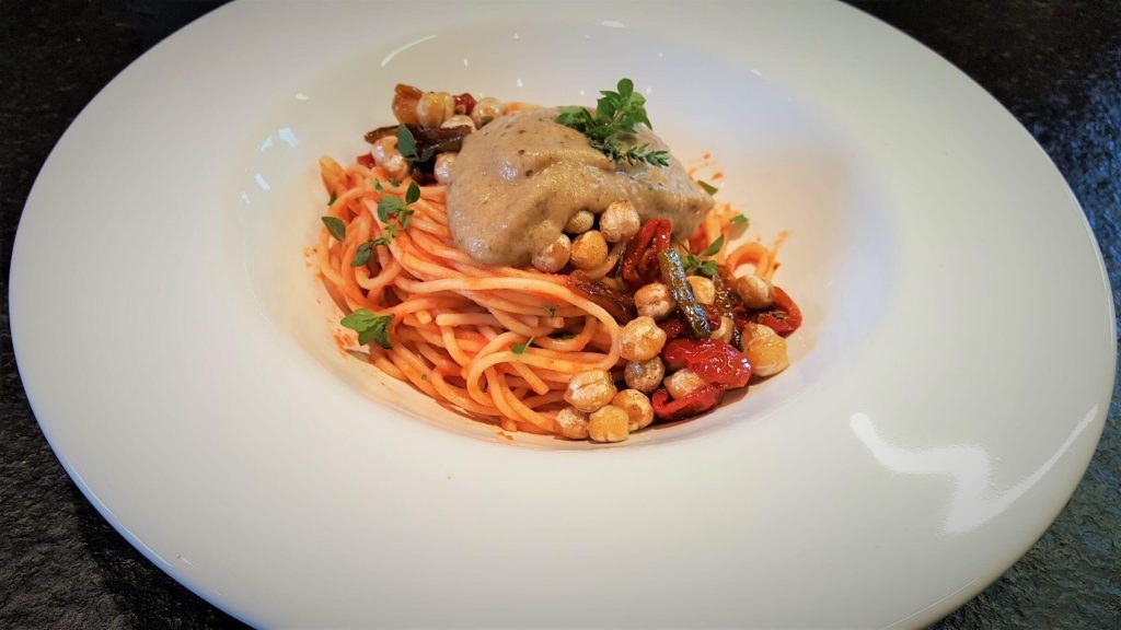 Spaghetti mit Auberginenmousse, Kichererbsen, getrockneten Cherrytomaten und Peperoni